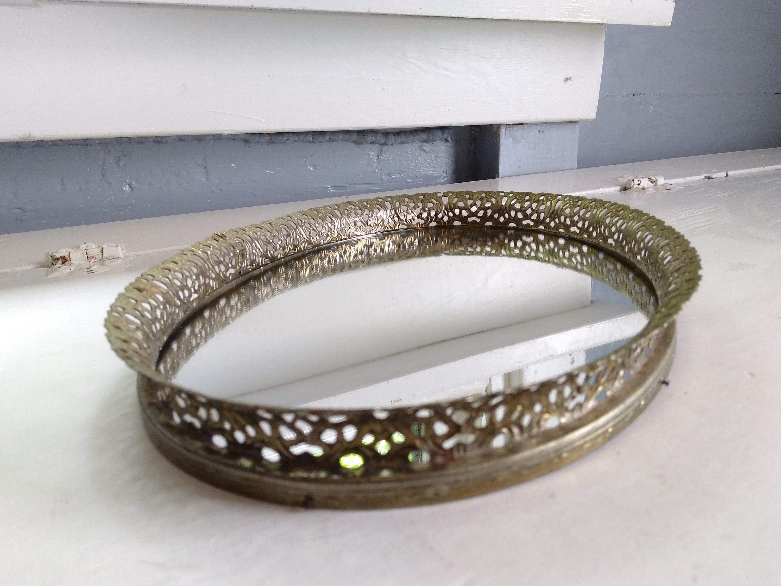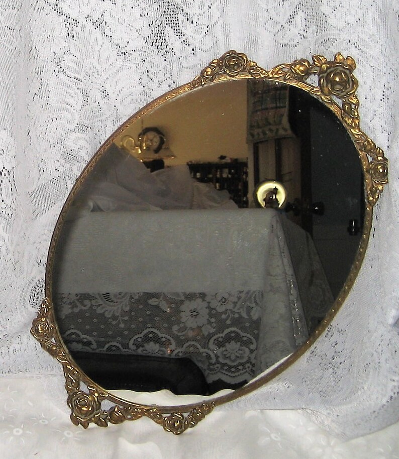 Vintage Mirror Tray Vanity Mirror Gold Oval Filigree Midcentury